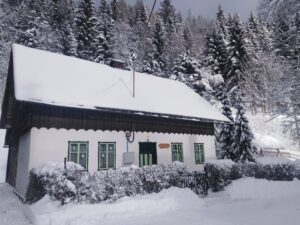 Když je dostatek přírodního sněhu, je nejbližší menší sjezdovka cca 200 m od chalupy